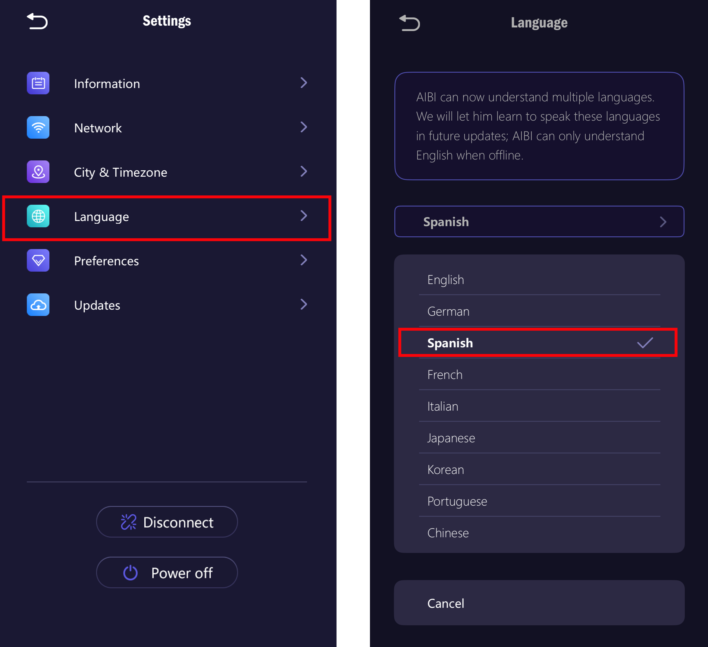 But currently, AIBI can only understand, respond, and speak in the following languages only: English, German, Japanese and Chinese, provided you select the desired language in the settings. As of now still have no official information from Living.AI about the implementation of any other languages.