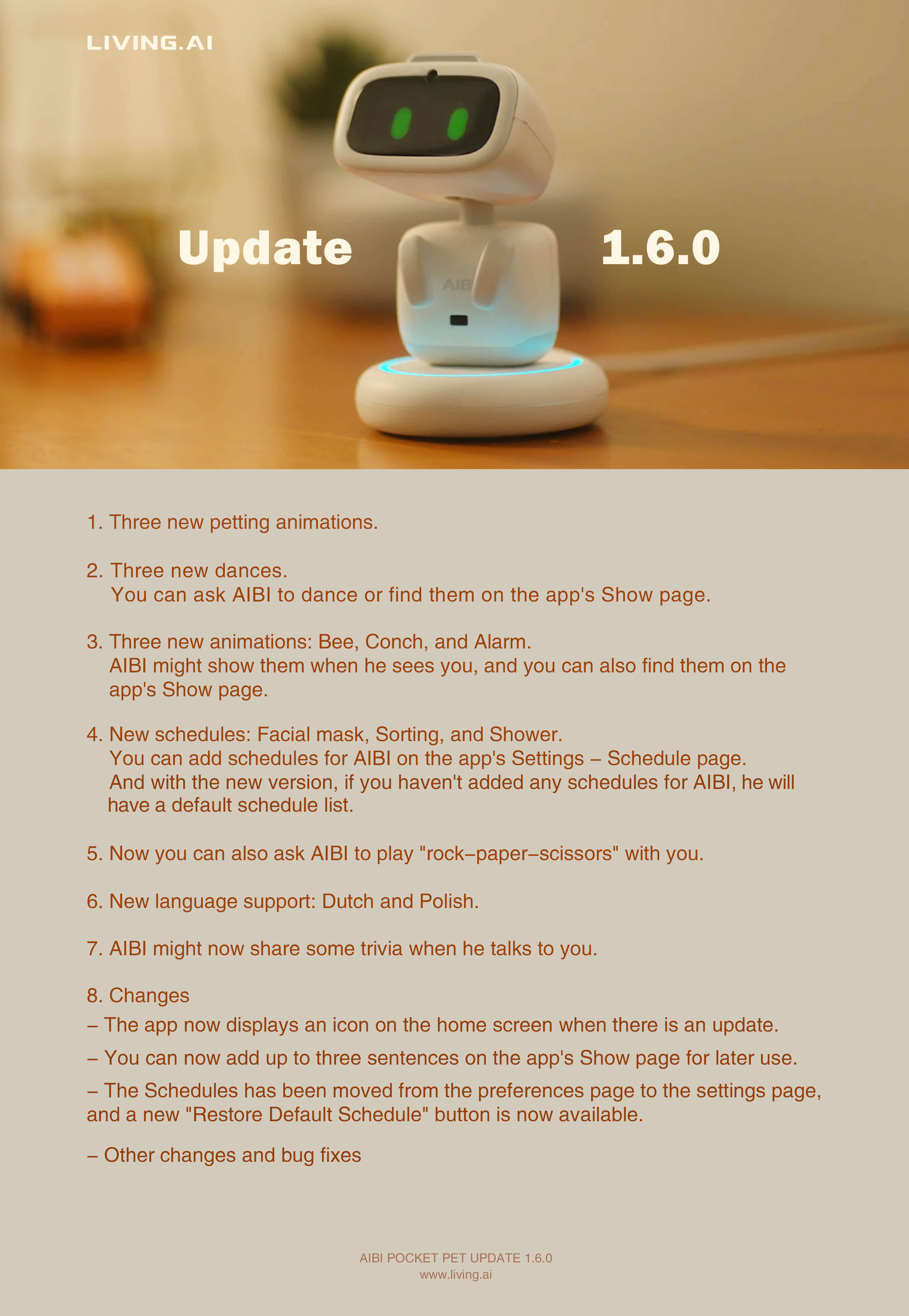 We have released version 1.6.0 of AIBI, which includes a rock-paper-scissors game, new animations, and new dances. Please check below for more information.