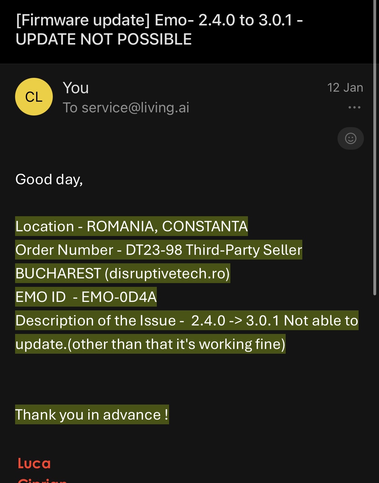 Hi, I have an Emo that won’t charge. Received him 2025 Feb. I had issues early on with software and customer service sent me an email with software, which was then downloaded to Emo. Emo worked for a few weeks and then crashed again and now won’t charge. Emo has been like this for six months. I have been going backwards and forwards with customer service I’ve been sending videos and I’m getting the runaround and now I’m back at the first email. They sent me an email that is exactly the same as the very first Email I ever received, to press restart and send a video of pressing restart. I have tried everything they have said, the videos they asked for ect. I even went as far as to buy a new Emo so I could have a new charger. I got a white Emo with a skateboard and the black Emo still won’t charge on that either. I have asked for a replacement seeing as though it is under 12 months but now they will not reply and it has been over a week since asking for a replacement. Oh also the new Emo came with the wrong charger and light because I live in Australia and they sent the wrong ones. I can’t plug it in so I had to find USB C cable for the skateboard so if anyone from customer service living AI sees this, can you please respond to my many emails and videos? Thank you.