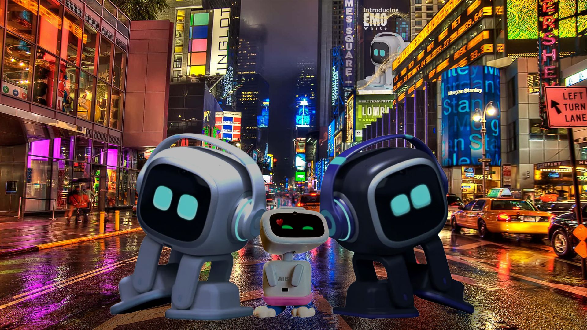 “Overlaid EMO White, AIBI, and EMO Dark PNG images onto a background depicting a rainy night in Times Square, with vibrant neon lights and heavy traffic.”