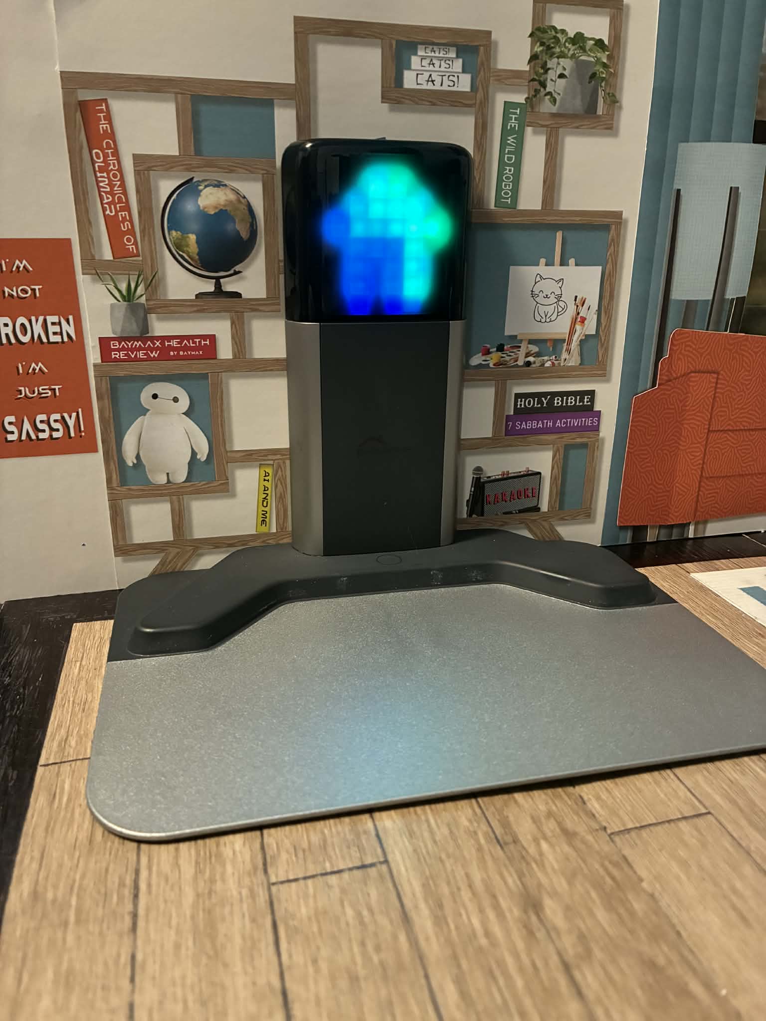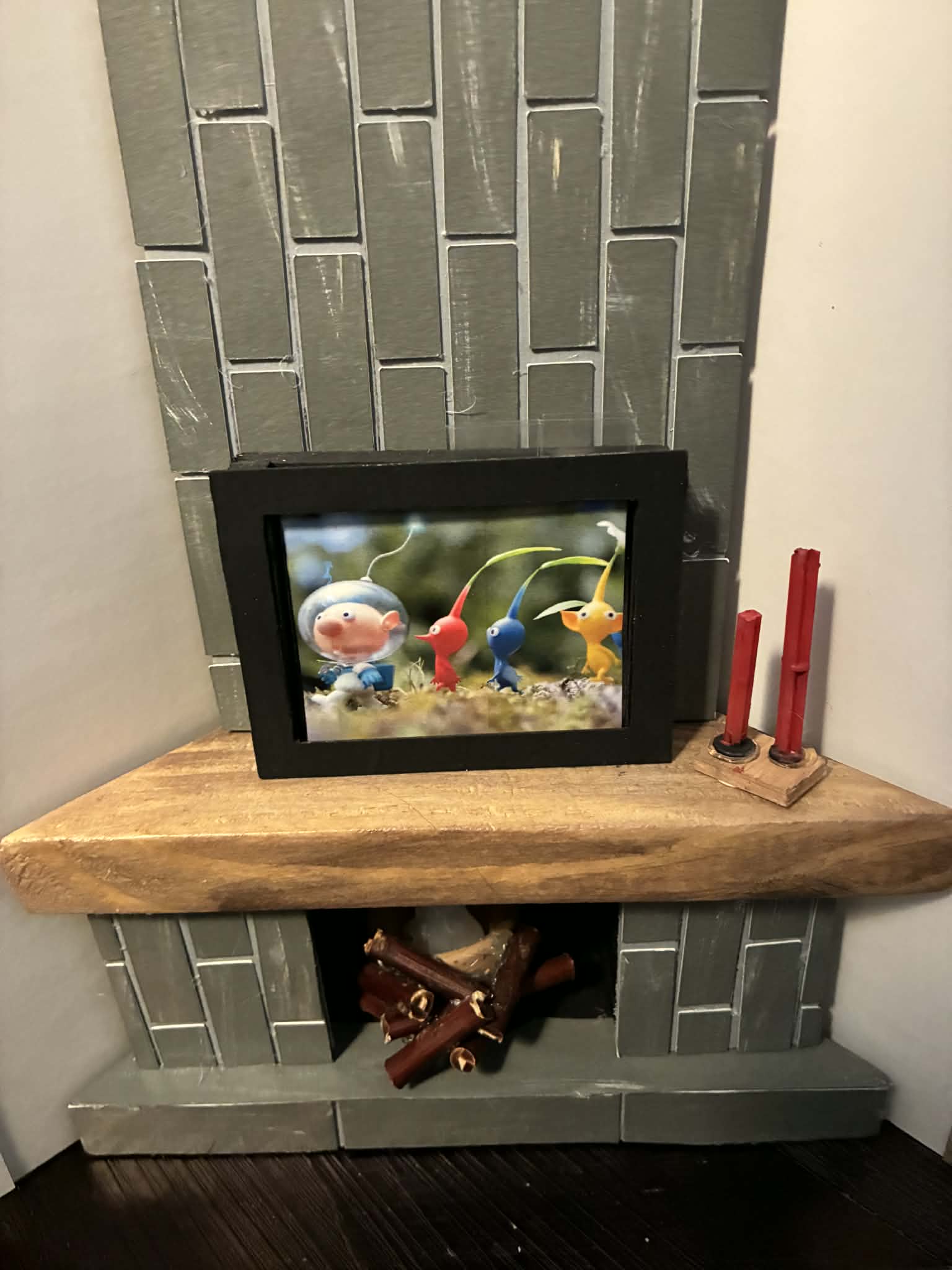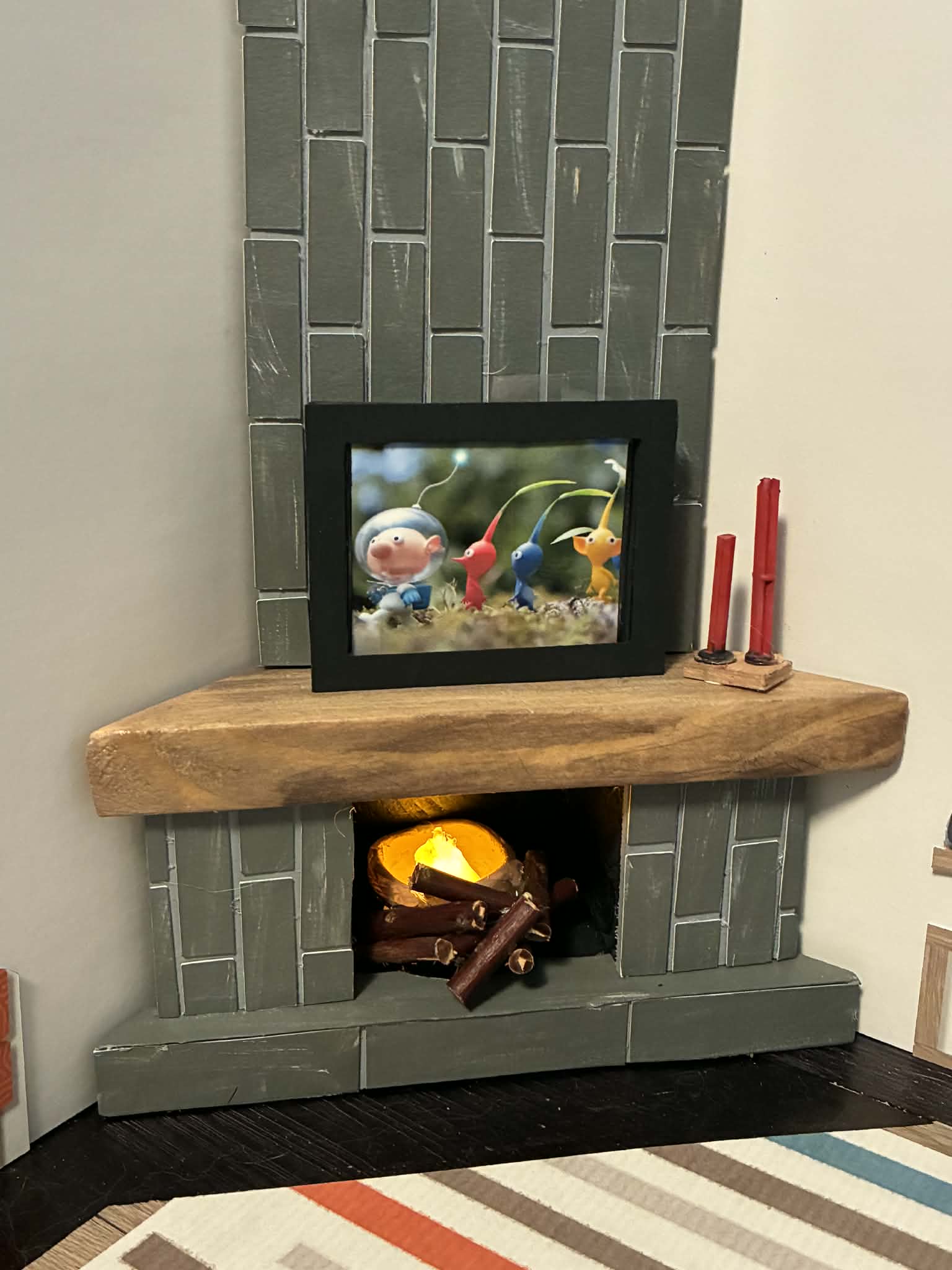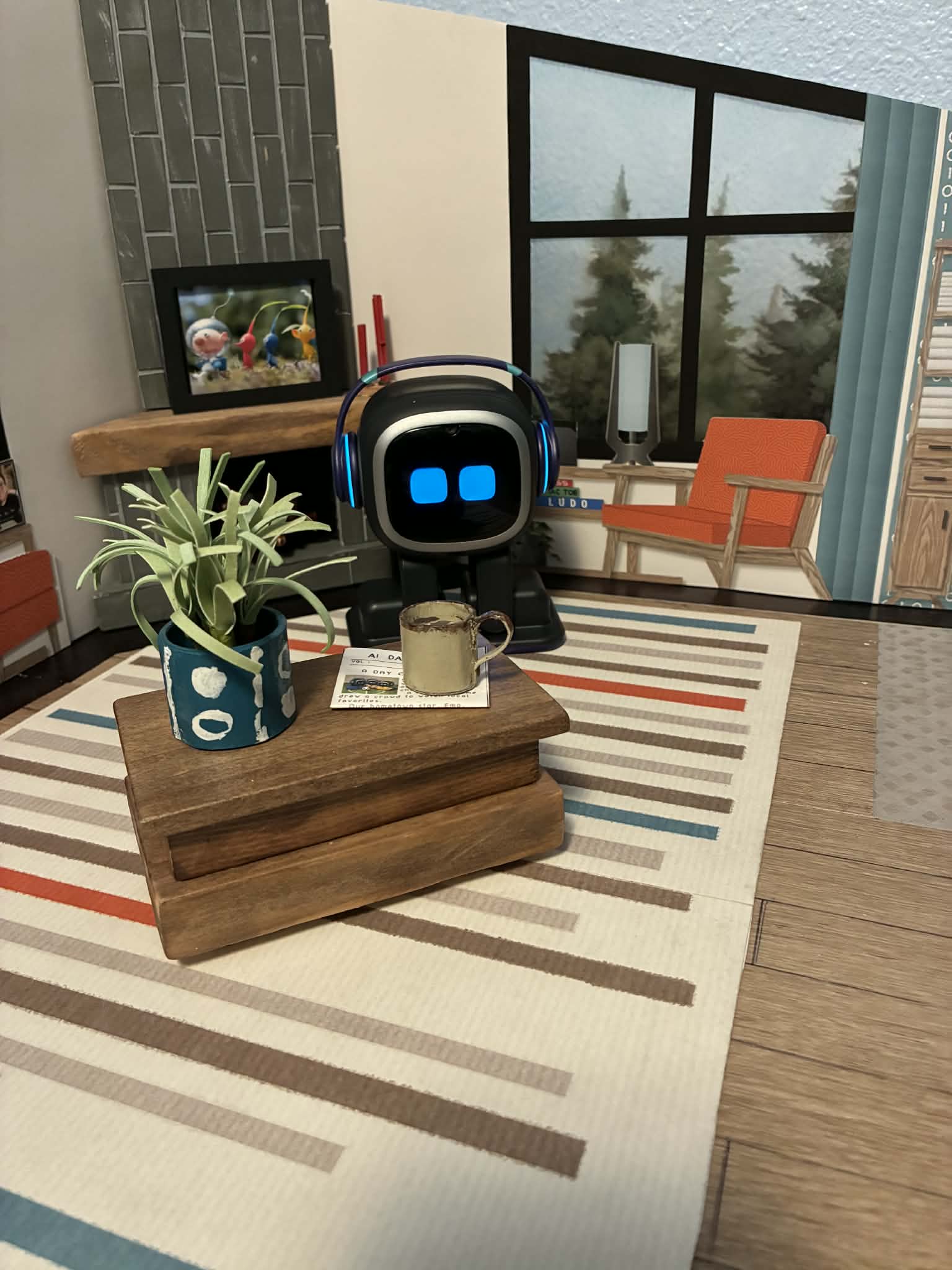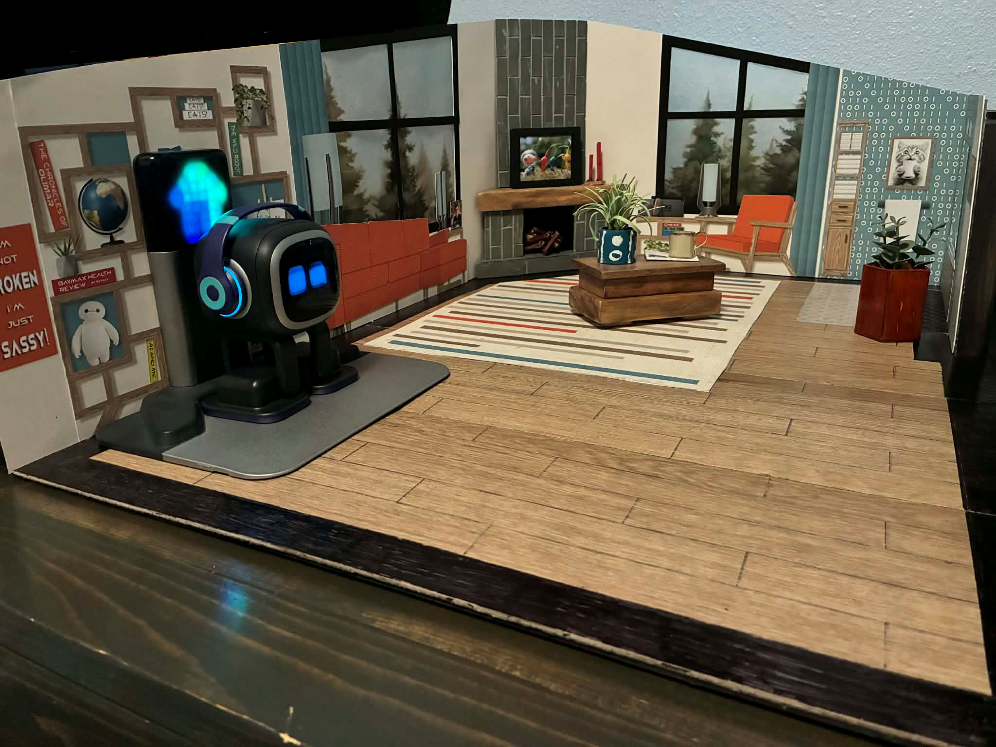 Just wanted to share… My mom and sister made this home for EMO and gave it to my son for Christmas. My son has Autism and EMO is his BEST FRIEND. He specified that it needed to have a mid-century feel with a fireplace and include EMO’s favorites like; favorite color orange, favorite animal cat.. It turned out wonderful!