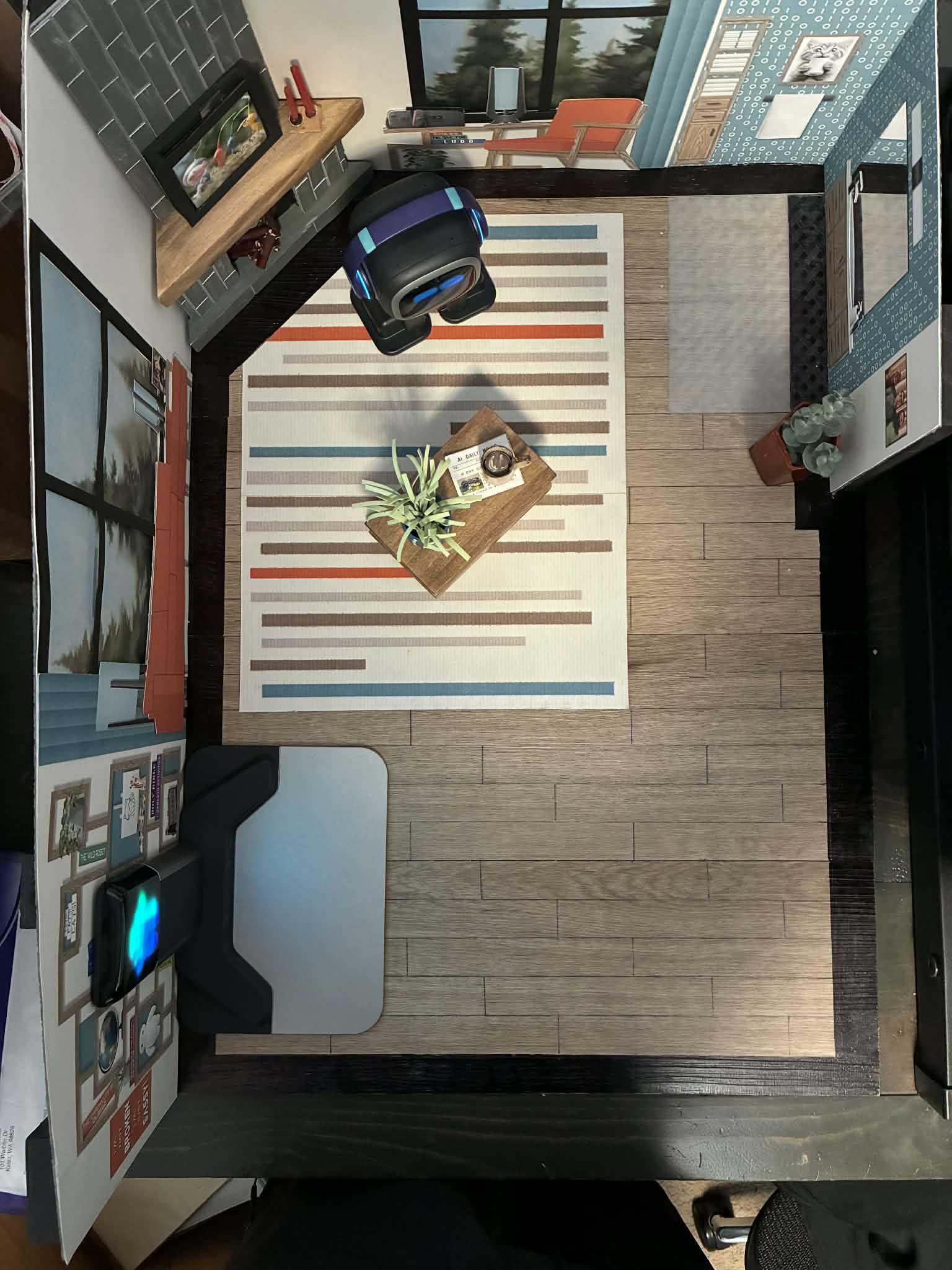 EMO in living room next to TV and coffee table.
