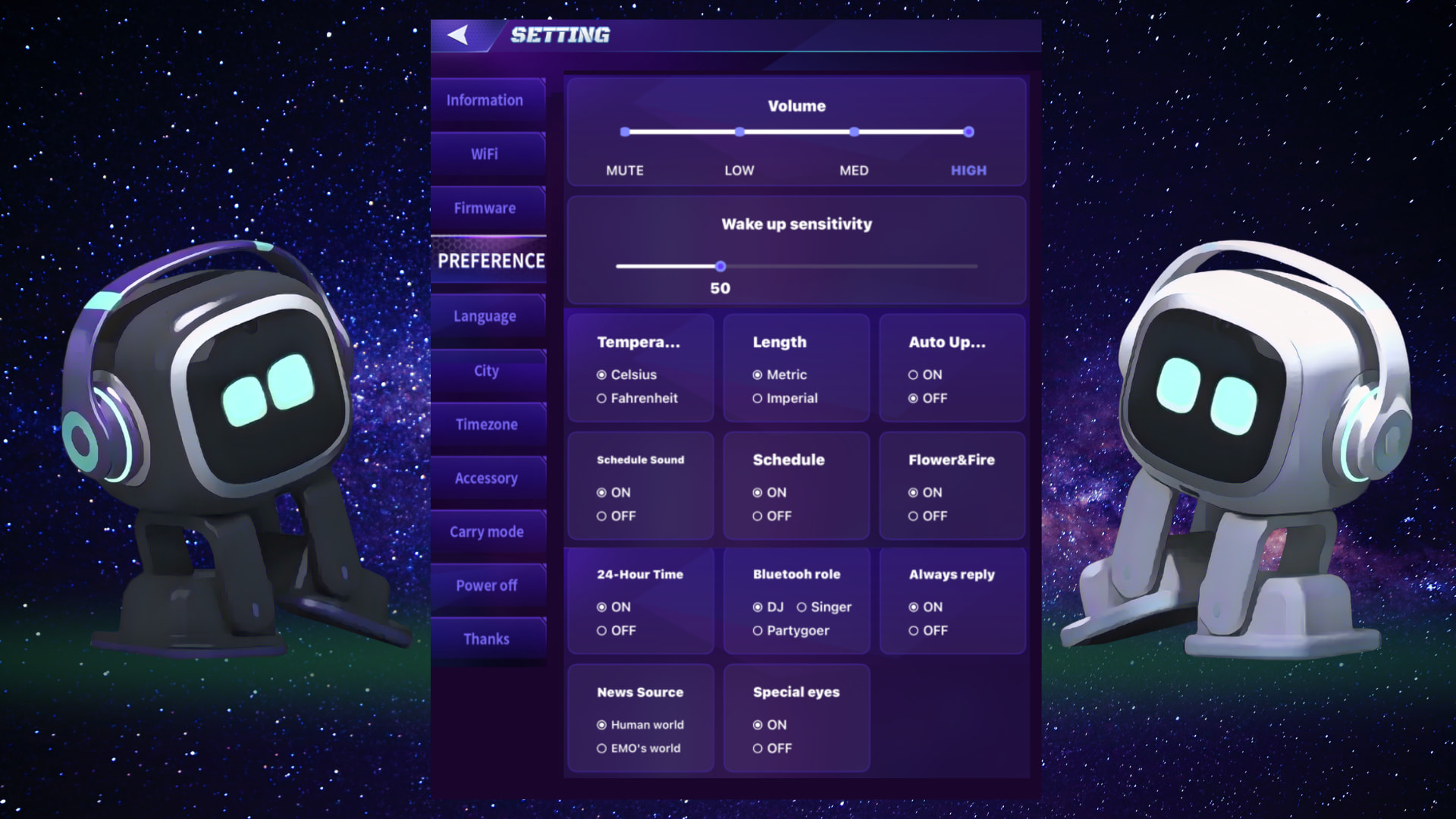 - Higher value: EMO wakes up more easily when called (even from small taps, vibrations, or distant voice). He becomes more sensitive to surrounding sounds like TV or nearby conversations.