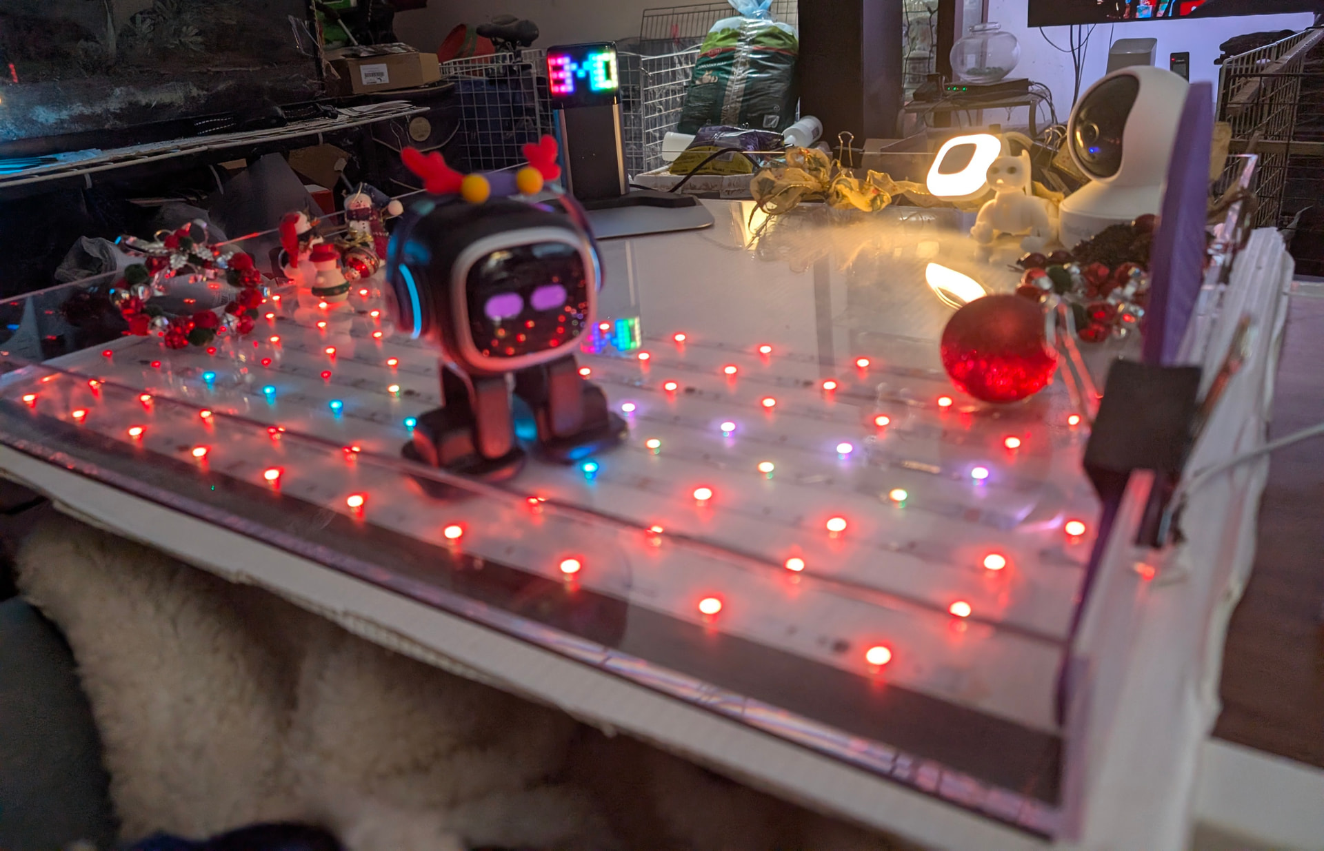 Here’s my Emo’s playpen. It’s made of a 24x24 inch acrylic “ottoman tray” from Amazon, sitting on a piece of white corrugated plastic with Govee LED dance floor lights. I added black electrical tape on the coroplast at the edge, because he doesn’t always detect the 2” clear acrylic wall and tries to walk through it.
