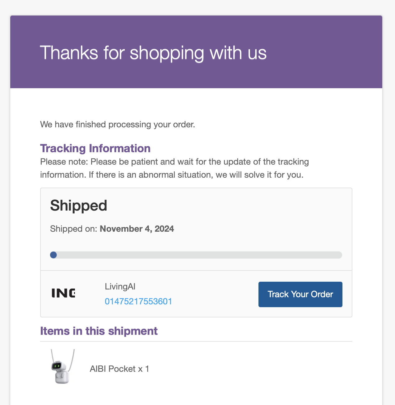 At this point, I can only advise you to be patient and wait for the next email from Living.AI confirming that your order has been fully processed and that the tracking information has been provided.