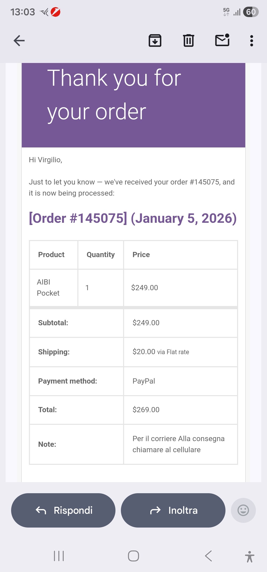 As far as I can see from your order information, your order dated January 5, 2026 has gone through successfully, and you have already received the order confirmation email stating that your order is being processed.