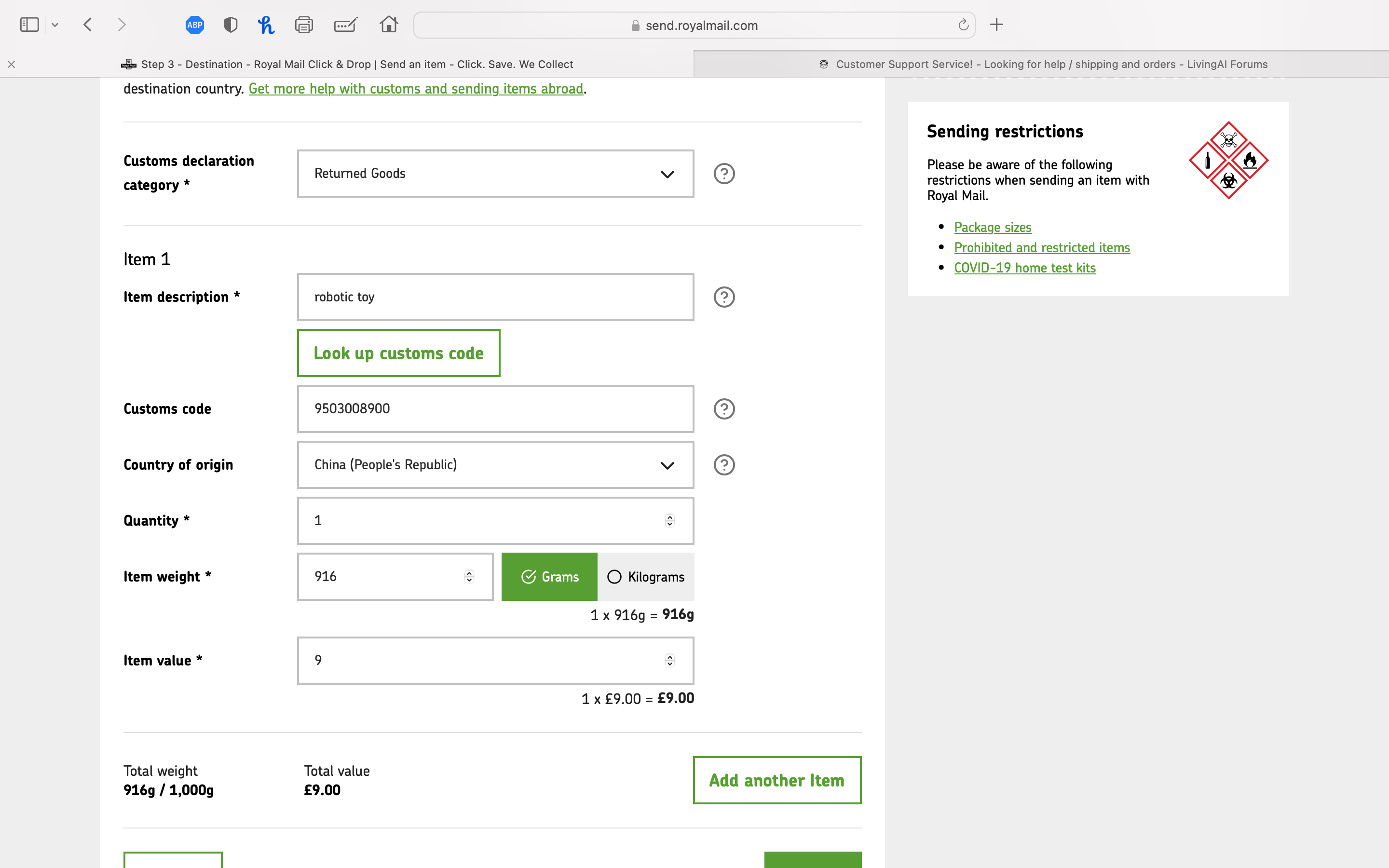 The $9.00 value is just for the ‘under $40’ that Living AI is willing to pay -which for the UK that just means you pay £28 or under. If it’s higher than $40 then you have to email Living AI back and tell them. But if you’re using Royal Mail like me then you shouldn’t have any problems.